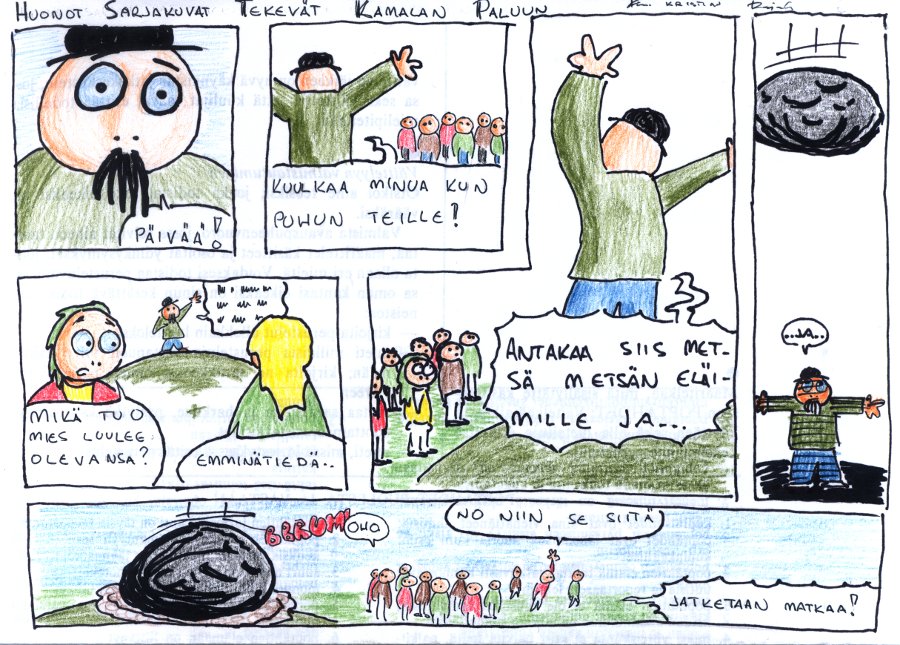 Joo, nimimerkki Tommi, kyllä, mutta tässä on sentään edes jokin itsenäinenkin pointti, toisin kuin jossain lapsena tekemissäni kyhäelmissä. Ehkä se pointti ei ole kovin syvällinen, ja kyllähän tämä on jo aikanaan ollut hämärä sisäpiirin vitsi, jonka nimimerkki TeemuM edelleen näemmä tunnistaa, mutta on tämä silti ihan “oikea” sarjakuva. Toisin kuin ne alkuperäiset “huonot sarjakuvat” sieltä rippileiriltä.