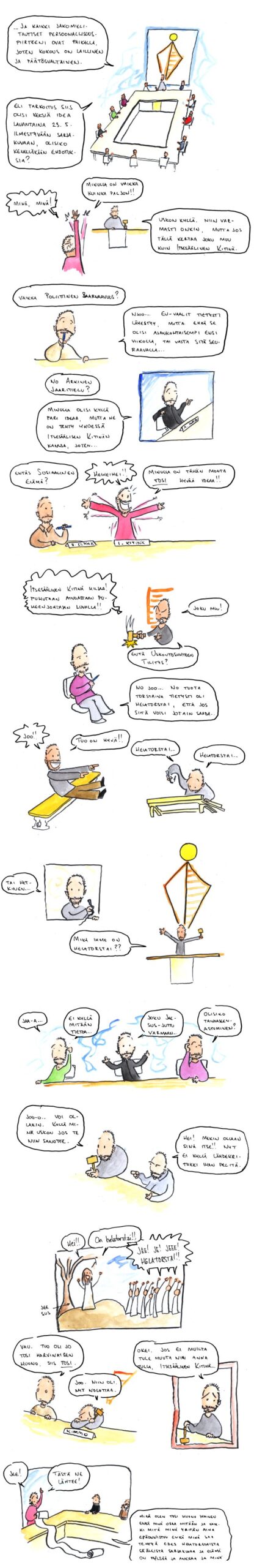 Eli vastauksena siihen klassiseen idioottikysymykseen "mistä saat kaikki ideasi", vastaus on tässä. Näin ne syntyvät, komiteatyönä. Tämä taas venähti pitkälle lauantain puolelle, mikä on sinänsä hassua, että poikkeuksellisesti aloitin piirtää tätä jo yli viikko sitten. Kirjoittelin jonkinlaisen alkeellisen käsikirjoituksen viimeviikkoisen sarjakuvani piirrosten selkäpuolelle, ja samalla luonnostelin jo lähes puolet näistä kuvista. Mutta tietysti sitten menikin viikko, että taas palasin tämän sarjakuvani ääreen, ja suurimmalta osin tein kaiken työn vasta perjantain iltakymmenen jälkeen. Pitäisi ottaa itseään niskasta kiinni ja tehdä nämä fiksummalla aikataululla. Etten vain joskus epähuomiossa pettäisi teitä, armaat Katvealueen kolme säännöllistä lukijaa. Tuo kokouksen tunnuksena oleva pyramidi ja pallo on muuten joskus 16-vuotiaana silloisesta nimikirjoituksestani tyylittelemä symboli, joka on, vaikka nimikirjoitus on myöhemmin muuttunutkin, sittemmin jäänyt yhdeksi useiten toistuvimmista piirroskuvioista töherryspaperieni marginaaleihin. Ajattelin sitten, että se sopisi hyvin päänsisäisen kokoukseni banneriksi. (Paitsi että banneri on anglismi, eikä sellaisten käyttö ole hyväksyttävää.)