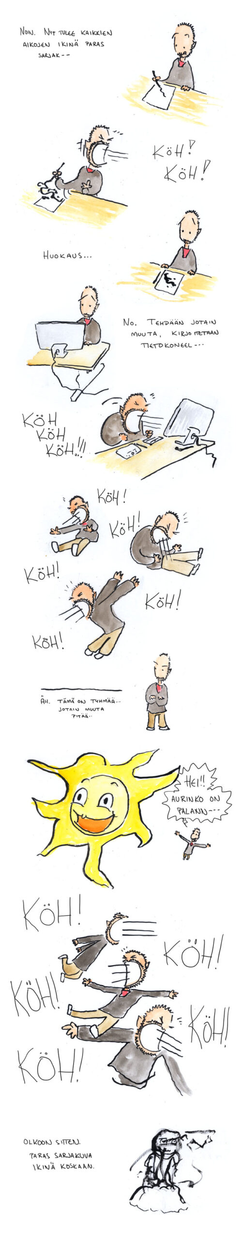 Minulla oli haave, että olisin nyt pariviikkoisen lomani aikana saanut piirreltyä ison pinon sarjakuvia, jolloin olisin pystynyt sujuvasti palaamaan kahden päivityksen viikkotahtiin, mutta toistaiseksi sinnikäs flunssani on antanut minulle ainoastaan kolme päivää jolloin olen ylipäätään voinut tehdä mitään muuta kuin lojua, niistää ja yskiä. Ja nekin päivät olen sitten käyttänyt muiden, yhteiskunnan silmissä tähdellisempien asioiden toimittamiseen.