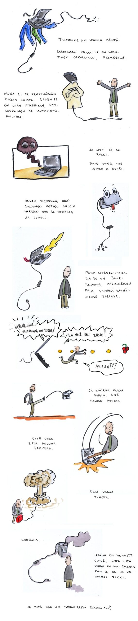 Itse sarjakuvasta sanottakoon, että minulle tuottaa suurta nautintoa piirtää itseni aiheuttamassa fyysistä vahinkoa tietokoneille. Suurta nautintoa ja mielihyvää.