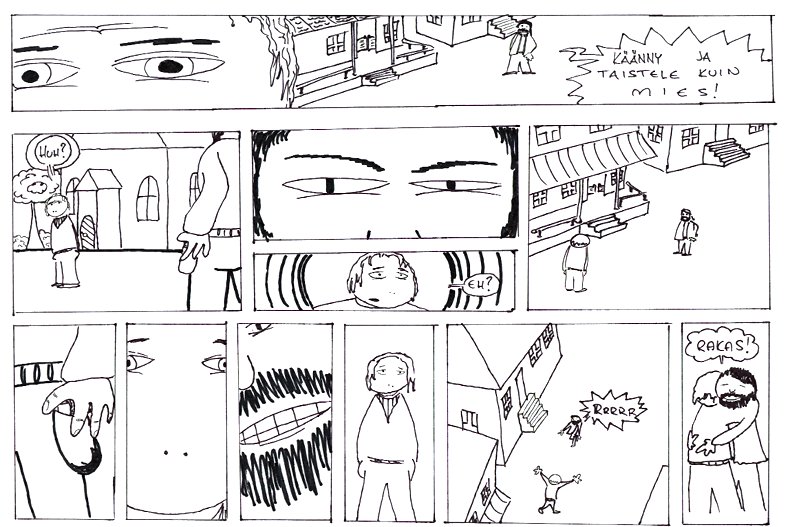 Tämä on piirretty - huokaus - kaksitoista vuotta sitten, lukion toisella luokalla. Piirtelin vain jotain aikaa tappaakseni, kunnes keksin että tarina pitäisi jotenkin lopettaakin. Sitten kävelin autokouluun, jossa Katvealueella nimimerkkiä TeemuM käyttävä yksi neljästä lukijastani istui edelläni, ja hän luonnosteli oppitunnin aikana paperiini sarjakuvalle lopun. En pidä tästä sarjakuvasta yhtään, mutta kun TeemuM:kin täällä kuitenkin ilmeisen säännöllisesti käy, niin tuodaan nyt hänenkin häpeällinen menneisyytensä koko luomakunnan tiedoksi. Sanottakoon kuitenkin, että kaikki mikä tässä sarjakuvassa on millään tavoin hyvää on lähtöisin Teemun kynästä. Paitsi tuon viimeisen kuvan ilmavuus, siitä pidän vähän itsekin.
