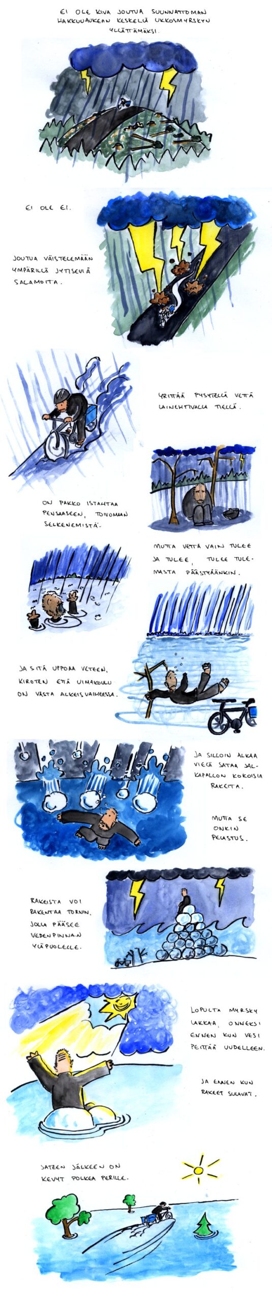 Pahat kielet väittävät, että minulla on taipumusta liioitteluun. Minä vastaan, että valitettavan vähän, valitettavan vähän. Tämä päivittyi nyt lauantaina, kuten olen luvannutkin, mutta se aamuyön neljä joka minulla aina tavoitteena on, oli jo lähes 20 tuntia sitten. Syitä oli monia, muun muassa se, että kesä on vienyt minulta käsityksen viikonpäivistä, mutta ennen kaikkea se, että tussaussiveltimeni oli mennyt hapsoille laukussani. Yritin pari tuntia pelastaa sitä, kunnes jouduin ottamaan toisen siveltimen käyttöön ja harjoittelemaan sen hyväksyttäväksi. Ei se lähellekään yhtä hyvin toiminut kuin vanha pensselini, mutta tuskinpa tuota eroa kukaan muu kuin minä huomaa (isompi ero tulee kuvankäsittelystä, jossa palasin monta askelta takaisin viime joulun joulukalenteria kohti -- ihan vain koska pidän tästä jäljestä enemmän). Käytin sitten kuitenkin myöhästyneen ajan ihan hyödyksi, ja kerrankin ihan ajan kanssa viimeistelin ja hioin sarjakuvani sellaiseen kuntoon että jopa minä voin hyväksyä sen. On siinä toki edelleen joitain perfektionistista sieluani kiusaavia pikkuvikoja, mutta noin pääpiirteissään ihan pidän siitä.