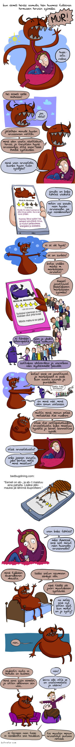 Palasin viikko sitten Suomeen oltuani kolme kuukautta ulkomailla, ja tiivistin matkani, etenkin tammikuisen Balkanin-kiertoni tällaiseen sarjakuvaan. Allegoriat ja metaforat ovat menneet moninkertaisille solmuille, eikä tämä varmaankaan lopulta kerro mistään mitään, mutta sanottakoon, että joo, luteita tuli ruokittua. Koputtelen puuta ja toivon, etten kuljettanut yhtään mukanani Suomeen. Ja yhtään hyvää arvostelua en jättänyt kenellekään, joka sellaista minulta kerjäsi. Itse asiassa en jättänyt yhtään arvostelua mihinkään. Minusta nämä netin palvelut, joihin jätetään arvosanoja, ovat tyhmiä. Hyvä arvosana saattaa kertoa siitä, että palvelu on pääsääntöisesti hyvä, mutta aivan yhtä todennäköisesti se on vain kuittaus käytetystä palvelusta. Huono arvosana puolestaan yleensä kertoo enemmän antajastaan kuin palvelusta -- mikä tulee korostuneen selväksi silloin, jos huonojen arvosanojen kirjallisia perusteita lukee. Jos hotelli on huono siksi, että "naapurustossa on paljon maahanmuuttajia", niin mitäpä siihen voi sanoa. Muistakaa antaa sarjakuvalle viisi tähteä kaikissa palveluissa, joissa tähditetään satunnaisia nettisarjakuvia.