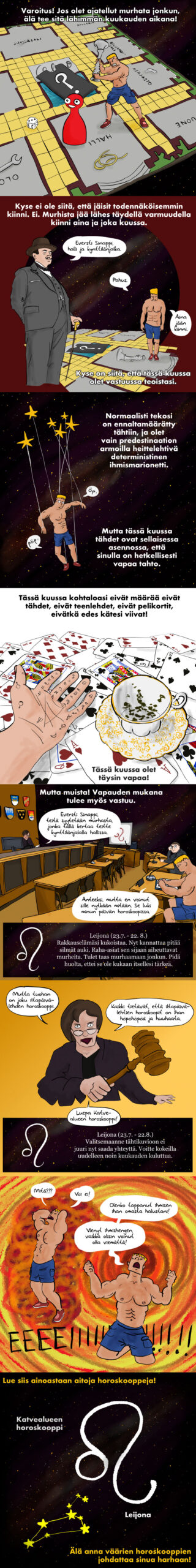 Ja ettehän murhaa ketään, koskaan, sanoi horoskooppinne sitten mitä hyvänsä. Ettehän?