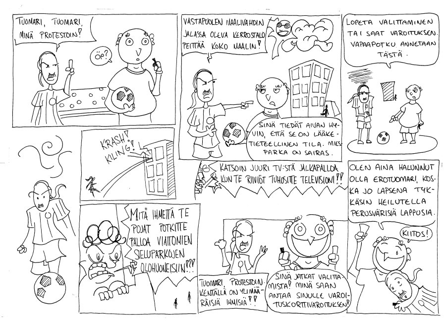 Tällä kertaa taas mustavalkoisena. Olen viime aikoina käyttänyt paljon aikaani valopöydän rakentamiseen, joten ehkäpä pian pääsemme tilanteeseen jossa ainakin suurin osa tänne lisätyistä sarjakuvista tulee olemaan väritettyjä. Valitettavasti vain olen aika avuton puutyökalujen kanssa, joten saa nähdä mitä tuostakin tulee. Tämä sarjakuva on ihan hauska ja vieläpä suht' hyvin piirretty, joten eipä tähän kai ole paljon lisättävää. Tuo kakkoskuvan pilvi on 'turbomustekala syömässä banaania', suoraan sieltä Pilviin katsomisen lyhyestä historiasta, ja tämä maalivahtina toimiva mies jolla on kerrostalo jalassa on tietysti myös esitelty jo aiemmassa sarjakuvassani. Jos ette muista häntä, niin klikatkaa tägejä, siksi ne on tuossa heti tämän tekstin jälkeen.