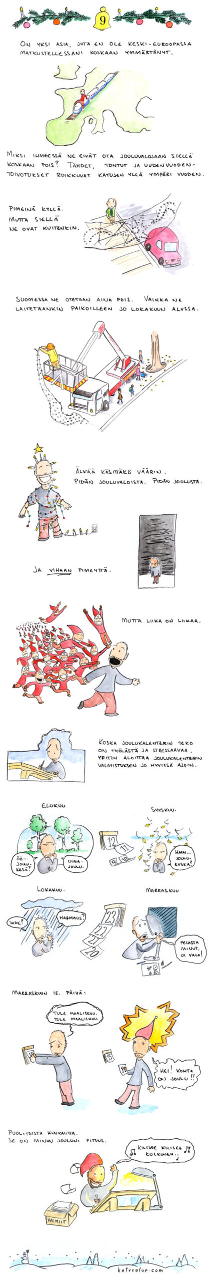 Tämän sarjakuvan kolme ensimmäistä kuvaa ovat ensimmäiset kuvat, jotka tämänvuotista joulukalenteria varten tein. En ole varma, mutta saatoin piirtää ne jopa lokakuun puolella. Joka tapauksessa totesin, että vaikka kuvat olivatkin kesäisiä, oli aivan liian aikaista joulukalenterin piirtämiseen, ja piirrokset jäivät vielä moneksi viikoksi pöydän kulmalle hautumaan. Siitä siis tämä sarjakuva kertoo. Oli tämä myös ensimmäisiä sarjakuvia joiden piirrostyön sain valmiiksi asti. Kuten kaikki Raikun neuleblogin kautta joulukalenterini löytäneet tunnistanevat, ja Raiku itsekin, kaksi niistä Raikun julkaisemista ennakkovilkaisuista joulukalenteriini oli lähtöisin tästä sarjakuvasta. Se viimeinen vielä julkaisematon kuva tulee sitten 15. päivä, että siihen asti voitte vielä arvailla mihin se liittyy. Muutama päivä sitten mainitsin ohimennen, että Katvealueella on kaksi sarjakuvaa, joista aidosti ja oikeasti pidän, ja olen ehkä jopa hieman ylpeä. Jätin sen lyhyen listan silloin kesken, joten ehkä nyt olisi hyvä aika paljastaa se toinenkin. Se jonka jo kerroin oli Sadistiset jumalat, ja se toinen -- nyt kun sarjakuvassani ruskajoulun ja Keski-Euroopan mainitsin -- Joyeux Noël! Kaksi vuotta sitten Ranskassa piirtämäni joulusarjakuva, joka ansiokkaasti yhdistää päätä nuolevan kissan, ruskan ja jouluaaton. Viisitoista. Vastustakaa korruptiota. Juhlikaa Tanganyikan itsenäisyyttä.
