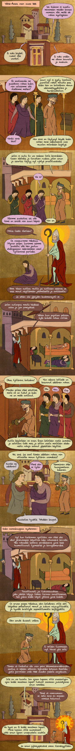 Sarjakuvan kertomus Myran piispa Nikolauksen ehkä tunnetuimmasta teosta pohjautuu Arkkimandriitta Mikaelin pyhimyselämäkertaan 800-luvun alkupuolelta. (Tai sen 1300-luvulla kopioidun version englanninnokseen.) Varsinkin sarjakuvan eräät mahdollisesti vanhentuneet sukupuoliin ja avioliittoon liittyvät arvotukset tulevat sieltä.