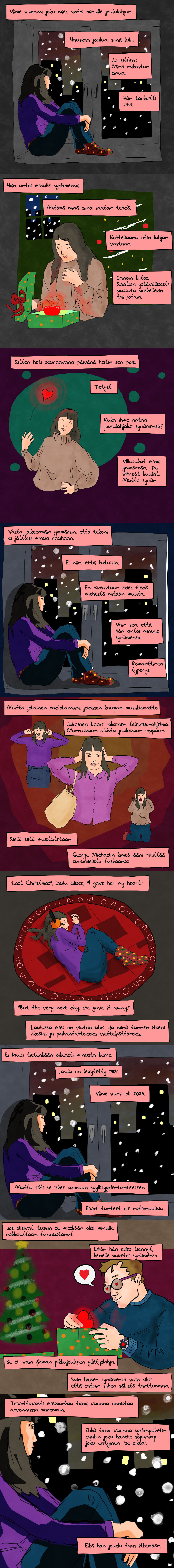 Tätä piirtäessäni katsoin ensimmäistä kertaa elämässäni Whamin Last Christmasin musiikkivideon. Ajatukseni oli, että olisin ehkä voinut ottaa siitä jonkin tunnistettavan kuvan, jota olisin voinut käyttää tässä sarjakuvassani – mutta osoittautui, että se on ehkä kaikkien aikojen tylsin ja yhdentekevin musiikkivideo. Biisi kestää kolme minuuttia, mutta silti minulla oli vaikeuksia jaksaa katsoa video läpi. Itse asiassa on hyvinkin mahdollista, että olen videon aiemminkin nähnyt, mutta olen vain unohtanut sen saman tien.