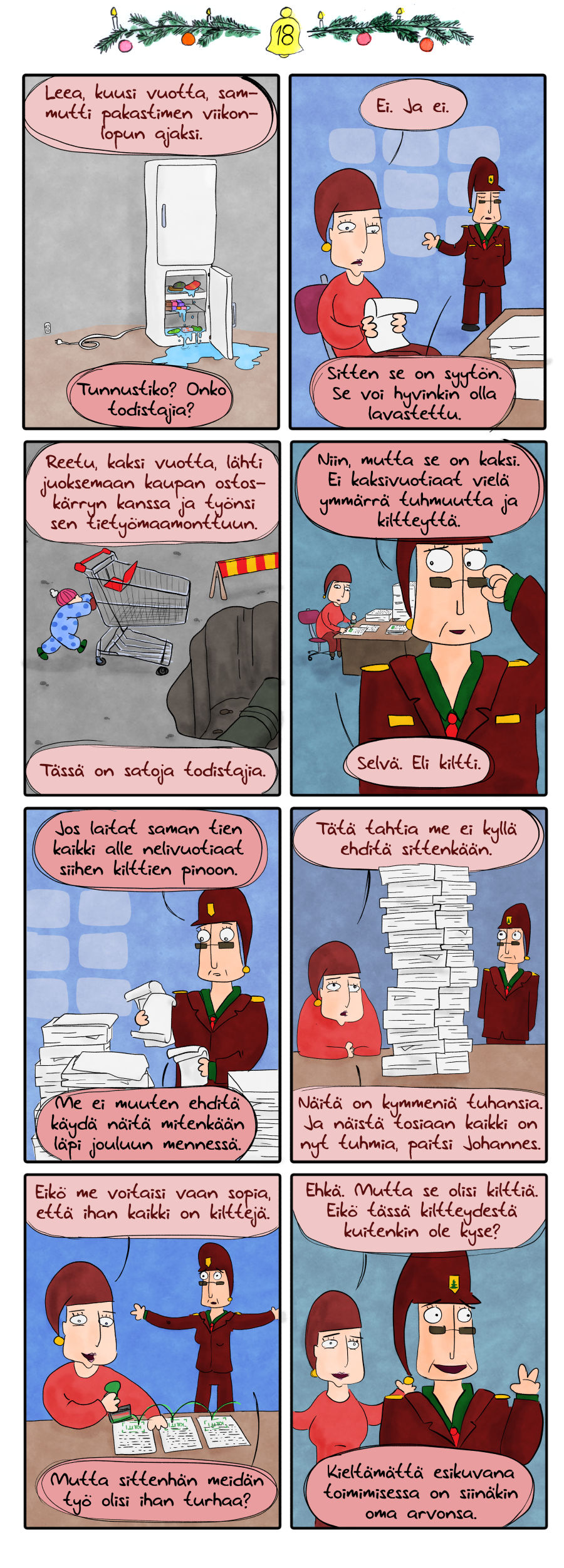 Yleisin piirustusvirhe tätä sarjakuvaa piirtäessä on ollut unohtaa tuon tiedustelujohtajatontun aurinkolasit. Kerta toisensa jälkeen olen joutunut palaamaan jo valmiisiin kuviin lisäämään silmälasit naisen nenälle, jonkun kerran jopa viime hetkellä ennen sarjakuvan julkaisua.