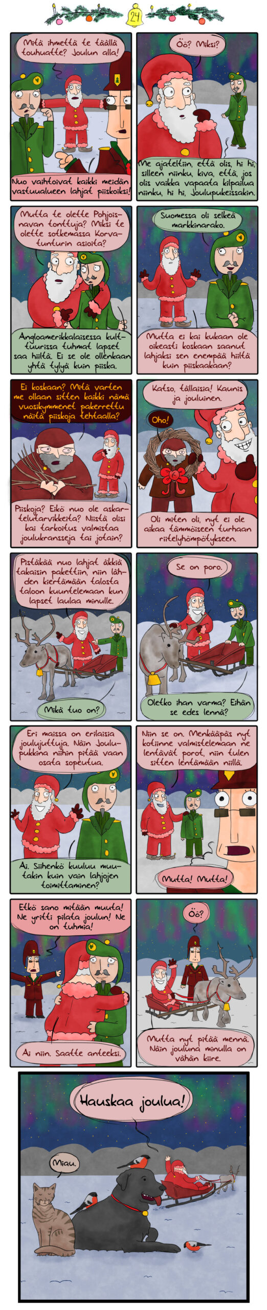 Mutta nyt on joulu. Nyt ei enää murehdita sarjakuvien piirtämisestä. Nyt levätään ja kuunnellaan joululauluja. Hauskaa joulua kaikille! Kiitoksia kaikille lukijoille, toivottavasti piditte joulukalenteristani edes hetkittäin!