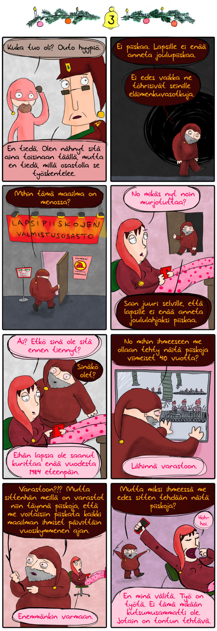 Ja älkää pelätkö. Tässä joulukalenterissa ei tulla piiskaamaan yhtään lasta, eikä luultavasti aikuistakaan. Ainakin tähän mennessä kirjoitetuissa ja piirretyissä sarjakuvissa piiskataan ainoastaan yhtä elotonta esinettä, ja sekin tapahtuu ruudun ulkopuolella.