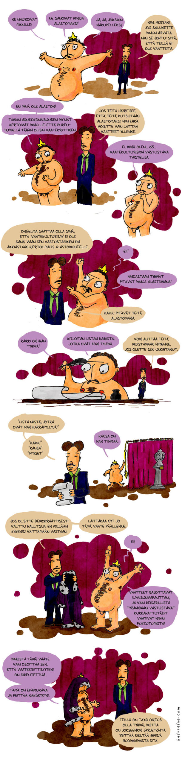 Että tällainen sarjakuva tällä kertaa. Alun alkaen, kun julkaisin tämän sarjakuvan, kirjoitin tähän tekstiin kirjoitusvirheen, jota korjatessani onnistuin kaatamaan koko Katvealueen. Katvealue oli lähes viikon nurin, mutta yritetään nyt uudestaan, ilman kirjoitusvirheitä. Viikon aikana sarjakuva onnistui menettämään kaiken ajankohtaisuutensa, mikä on itse asiassa ihan mukava asia. Eipä pidä pelätä, että tämä lähtisi leviämään sosiaalisessa mediassa, ja kommenttikenttäni täyttyisi rasittavasta möyhäämisestä.
