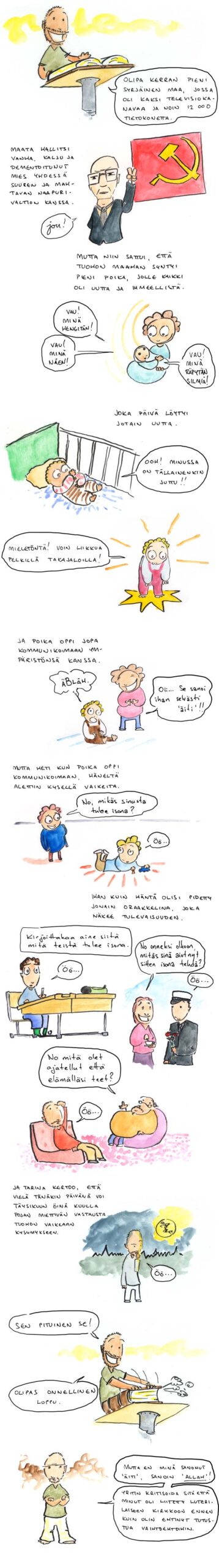 Siitä onkin todella pitkä aika kun psykiatri on viimeksi näyttäytynyt sarjakuvissani. Minun piti ihan arkistoista tarkistaa miten se piirretään. Hyvä että tarkistin, sillä muuten sillä olisi ollut vääränlainen parta. Minulla on kummallisia skanneriongelmia. Tietokoneeni aina yhtäkkiä ilman mitään syytä päättää että skannerini ei ole kiinni tietokoneessa, enkä ole keksinyt mitään muuta tapaa korjata tätä tilannetta kuin odottaminen. Tietokoneen uudelleenkäynnistys ei auta, johtojen irrottaminen ja uudelleenkiinnitys ei auta, mutta kunhan vain maltan odottaa niin viisi tuntia myöhemmin se alkaa taas skannata. Onnekseni en ole deadline-velvollinen kuin enintään itselleni, koska muuten tämä saattaisi tuottaa isoja ongelmia. Yleisesti ottaen olen kuitenkin päättänyt, etten enää pyytele anteeksi myöhästelyjäni tai epäsäännöllisyyttäni näissä kommenteissani, koska se on vain tarpeetonta ja tyhmää niille jotka lukevat sarjakuviani arkistojen kätköistä. Tiedätte te että olen pahoillani ilmankin. Sarjakuvan otsikko viittaa syntymäpäivääni viime viikolla.