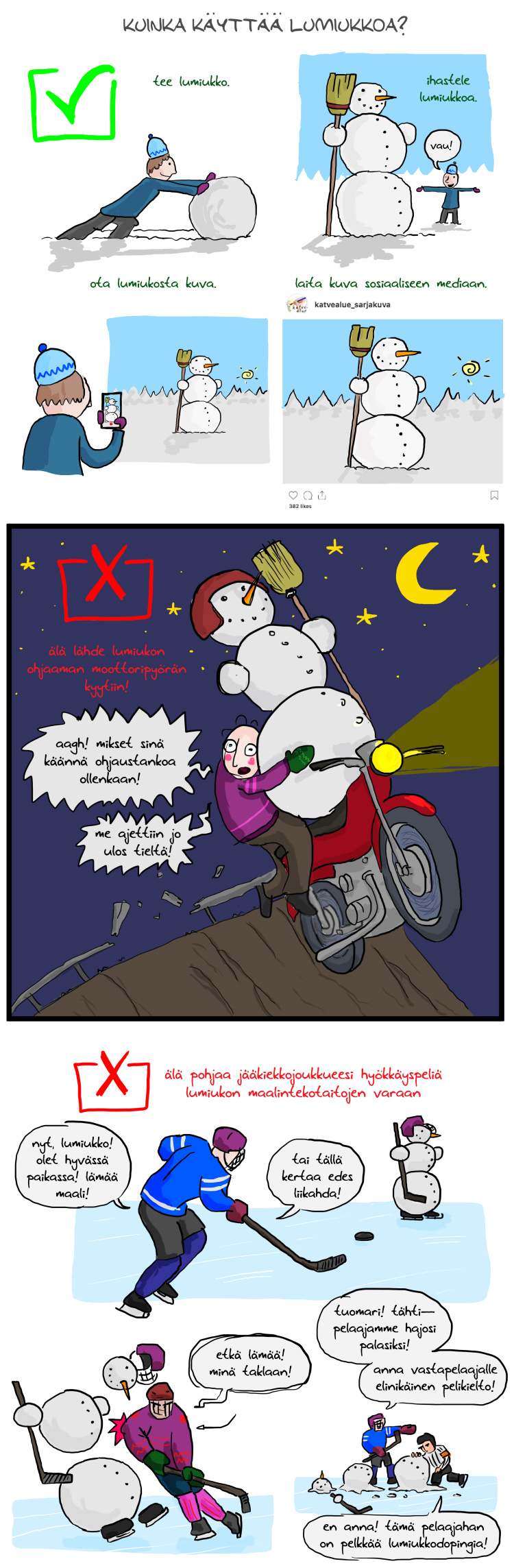 Nämä sarjakuvat on piirretty ensisijaisesti Instagramia ajatellen, joka osaltaan selittää niiden rytmitystä, ja olen tehnyt tänne nettisivuille julkaistavan version vasta nopeasti jälkikäteen. On virkistävää pitkästä aikaa miettiä sivujakoa ja kuvakokoa sarjakuvaa tehdessä, sen sijaan että vain piirtelisin kuvia ja heittelisin niitä kokoon. Katvealueen Instagram-nimi on @katvealue_sarjakuva.
