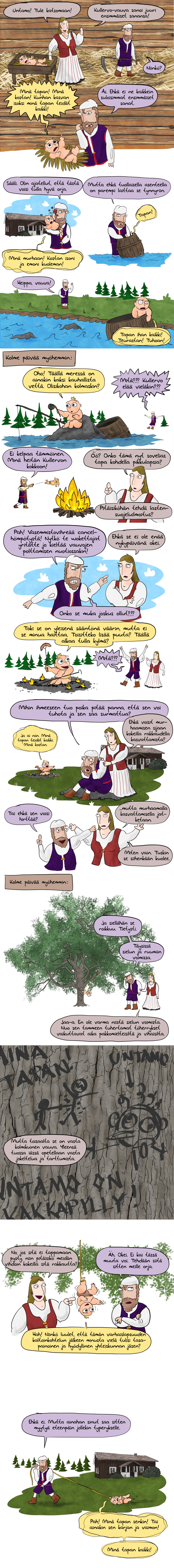 Minulla oli ongelma tämän sarjakuvan kanssa, sillä en todellakaan halunnut piirtää sellaista kuvaa, jossa hirtetään vauva -- mutta toisaalta kohtaus, jossa hirressä roikkuessaan Kullervo raapustaa tammen kyljet täyteen kostonhimoisia piirroksia, oli koko tarinan mielenkiintoisimpia. Joten kiersin ongelman vain jättämällä hirtetyn vauvan piirtämättä, ja laitoin Kullervon roikkumaan mahastaan ja raajoistaan. Paljon kivempaa.