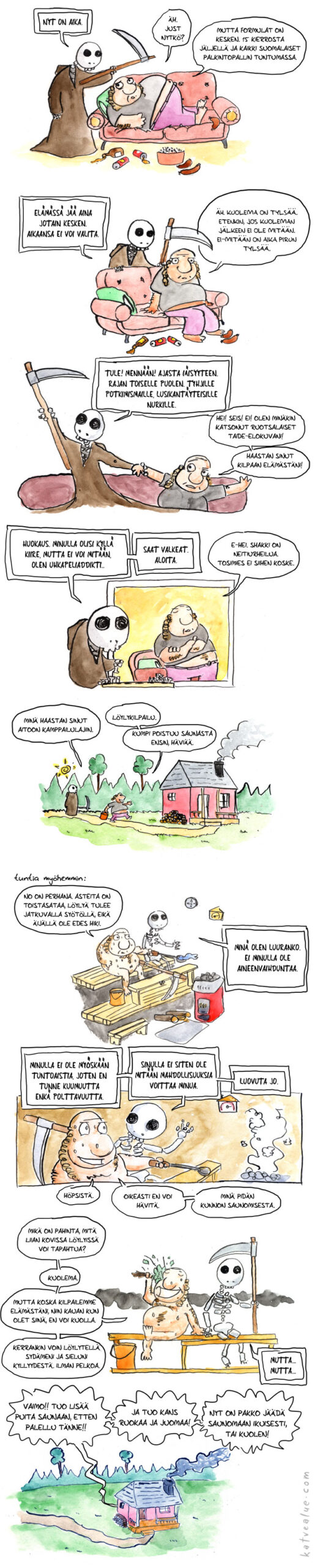 Joten nyt kun olen aloittanut aktiivisen taistelun sekä henkisiä että fyysisiä ongelmiani vastaan, Katvealue päivittyy jälleen. En kuitenkaan saanut mitään hyviä uusia ideoita, joten nappasin vanhojen käsikirjoitusten pinosta satunnaisotannalla muutaman vuoden takaisen tarina-aihion ja kirjoitin ja piirsin sen valmiiksi.