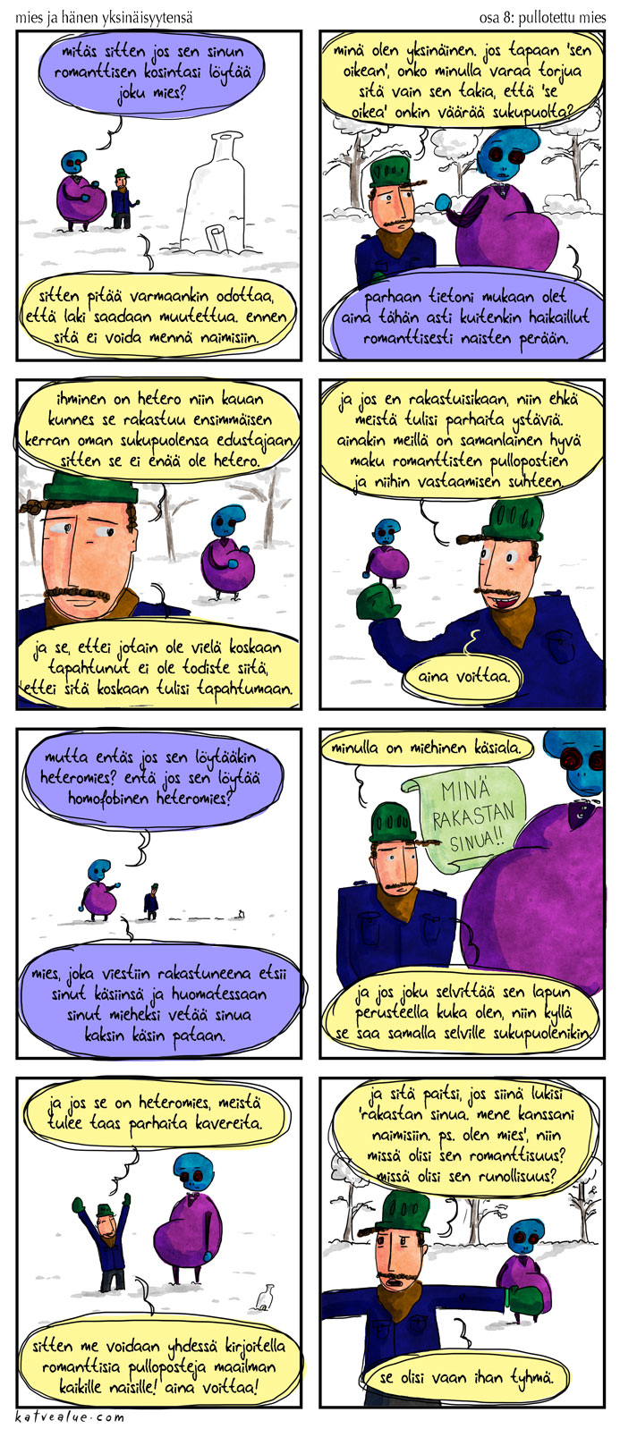 Kertokaa te. Haluatteko yksinäisen miehen tarinalle onnellisen lopun? Vai onko miehen kömpelö seuran etsiminen itsessään sarjakuvien arvoista, ilman että se varsinaisesti muodostaa minkäänlaista tarinaa? Vai joko koko typerä mies ja hänen yksinäisyytensä alkaa ottamaan päähän ja haluaisitte ennemmin lukea outoja, vasemmistovihreitä, poliittisia suvakkisarjakuvia?