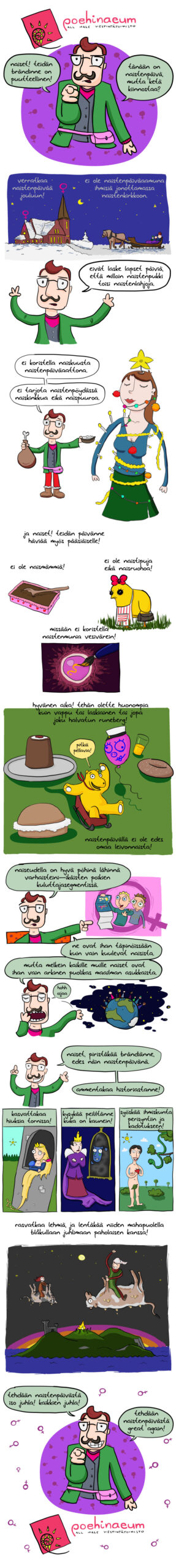 Naiset, keksikää päivällenne jotain bilesisältöä. Vaikka jokin sellainen Women Pride -marssi tai jotain. Tai edes joku viisituntinen ohjelma, jossa katsotaan kun joku kättelee muita ihmisiä, ja sitten anarkistit ja natsit riehuu kaupungilla. Jotain.