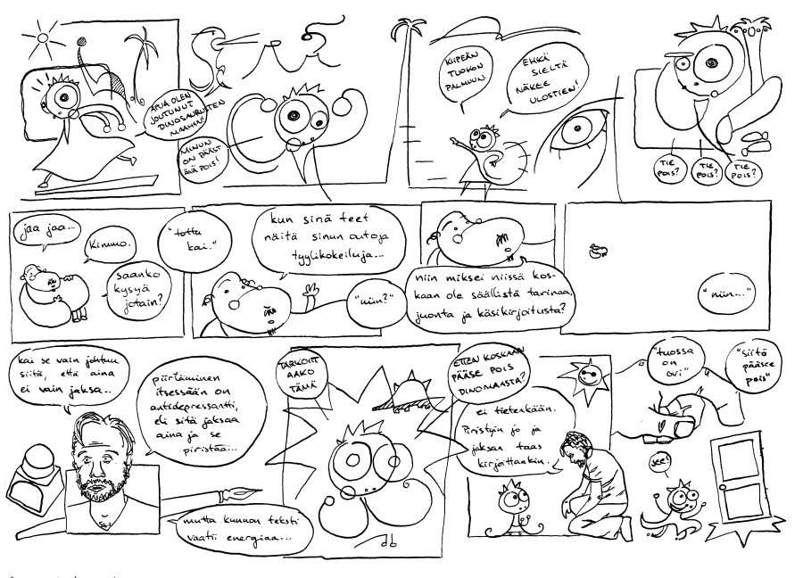 1. Se on hyvä. Se on todella hyvä. Ja neljäs ruutu sai minut kuulemaan repliikit päässäni. Ja rakastuin ihan täysiä tuohon Dinosaurusmaahan joutuneeseen olentoon. Se uhkaa jopa terapeutin paikka lempparinani. Ja koska sinusta olen pitänyt aina ja nämä kolme hahmoa yhdistyvät tehokkassa metatekstuaalisessa sarjakuvassa, olen myyty. Ja hyvään hintaan vieläpä.