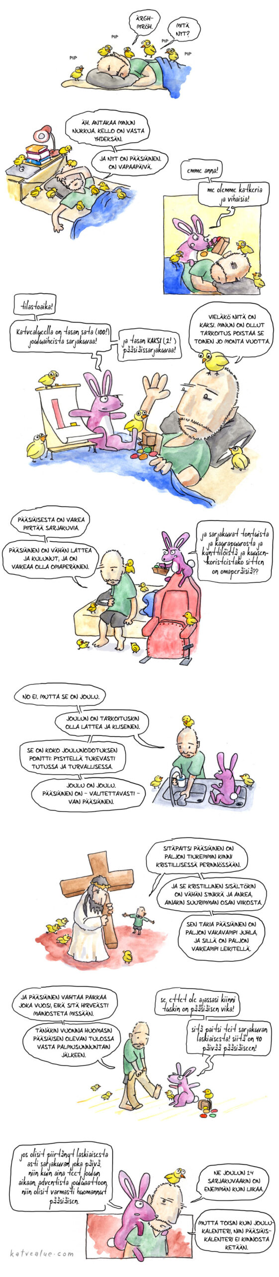 Joka vuosi pääsiäisen aikaan minulla on ollut sellainen olo, että minun pitäisi piirtää pääsiäissarjakuva -- kun kerran niitä joulusarjakuviakin niin urakalla aina työstän -- ja aina olen jumittunut siihen, etten keksi aiheesta mitään järkevää sanottavaa. Kirjoitin sitten vain sen vuosittaisen sisäisen dialogini sarjakuvaksi.