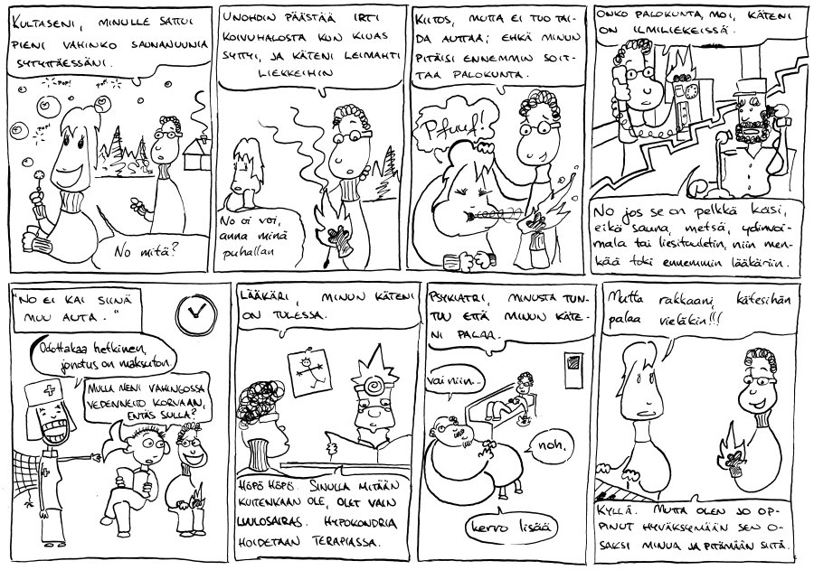 Tuo jonotuskuva johtuu puolestaan siitä, että olisiko ollut juuri päivää ennen tämän piirtämistä olin viettänyt rattoisan päivän Meilahden ensiapujonossa, ja purin sen aiheuttamaa lievää tylsistymistä sitten tähän kuvaan.