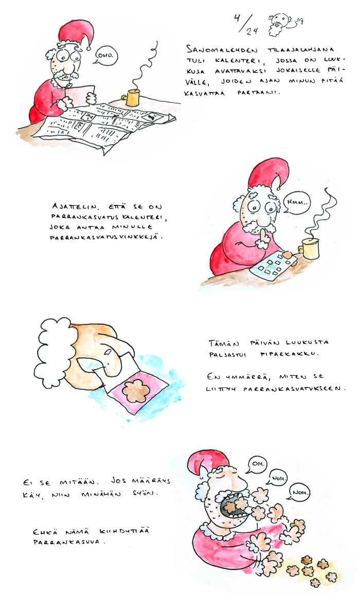 Minun ei ollut tarkoitus tänä vuonna tehdä joulukalenteria. Mutta viimeisenä iltana kun kotona pakkailin rinkkaani, ja mietiskelin jotain teemaa, jonka ympärille voisin rakentaa mahdollista kirjoitettua matkablogia (jota en siis pidä), yhtäkkiä keksin höpsön idean Joulupukista, joka kasvattaa partaansa. Keksin nopeasti ainakin viisi neliruutuista ideaa aiheen ympärille, ja ajattelin, että tästä voisi saada aikaan kaikki vaadittavat 24 sarjakuvaa.
