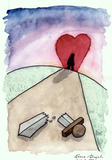 Pyydän anteeksi. Tämän viikon bonussarjakuva jäi luonnosvaiheeseen, enkä ehtinyt viimeistellä sitä, joten joudutte taas kerran katsomaan arkistojeni aarteita. Tämä on siviilipalveluksen koulutusjaksolla melko tarkkaan kymmenen vuotta sitten tekemäni työ, joka on ensimmäisiä koskaan tekemiäni yritelmiä vesiväreillä. Ja se oli myös viimeisiä ennen viime joulukuuta, jolloin aloin tehdä joulukalenteriani tänne. Eli tästä näette vesiväritaitojeni lähtökohdan. Totta kai nykyinen palettini on parempi ja olen käyttänyt rahaa myös siveltimiin ja kaikkeen tällaiseen elitistiseen hienosteluun, mutta yhtä kaikki, melko lailla yhtä huono olen edelleen kuin 10 vuotta sitten. Ja tietysti tuossa kuvassa pitäisi olla auringonnousu eikä lasku, koska sellaisena se olisi huomattavasti järkevämpi.  No, menköön, annetaan pikku-Kimmolle anteeksi huonoutensa, ja muistetaan ettei hän ole kymmenen vuoden päästäkään sen parempi. Kyllä. Tarkoitukseni olisi huomenna pyöräillä ainakin 140 kilometriä, joten on parempi mennä nukkumaan. Sen vuoksi se sarjakuvakin jäi nyt keskeneräiseksi. Hyvää yötä.