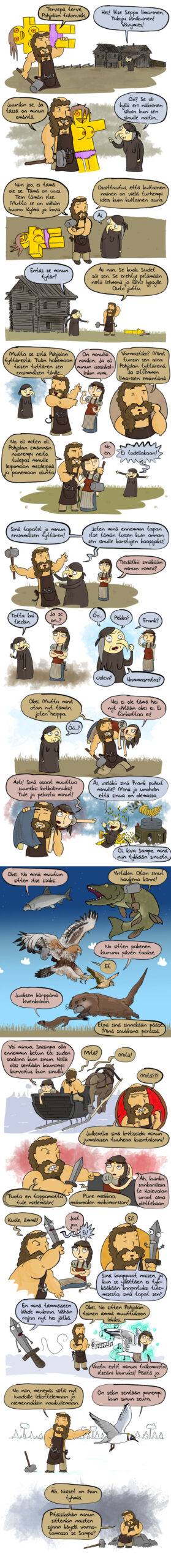 Tämä on visuaalisesti jatko-osa muutama vuosi sitten piirtämälleni sarjakuvalle, jossa Ilmarinen kynti kyisen pellon. Eli Ilmarinen on sama, mitä nyt kaljuuntunut, talo on sama, ja Pohjan eukko on samannäköinen. Ilmarisen persoonallisuus vain on vähän vaihtunut sarjakuvien välillä, mutta sitä se elämä ihmisille tekee. Tai sitten epäjohdonmukainen alkuteos, jossa ihmisten motivaatiot on täysin hatusta tempaistuja.