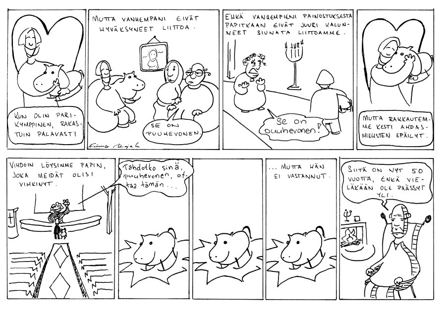 Sillä tällä kertaa tästä sarjakuvasta minä pidän. Olkoonkin, että muutamakin lukija on ihan aiheellisesti huomauttanut puuhevosen muistuttavan enemmän virtahepoa, ja että sarjakuvassa on parikin luokatonta, uudelleen piirtämistä vaativaa kuvaa, niin kokonaisuus on kuitenkin rytmillisesti ja sisällöllisesti toimiva. Kun sain sarjakuvan aikoinaan valmiiksi, olin aidosti innoissani: voinko minä saada aikaan jotain näin hyvää.