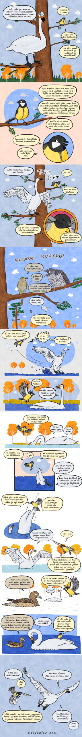 Alunperin tarkoitukseni oli myös värittää joutsen selkeämmin harmaaksi, niin kuin nuori joutsen on, mutta totesin, että linnun tunnistamiseksi ehkä tämä lähes täysin valkoinen on kuitenkin parempi ratkaisu.