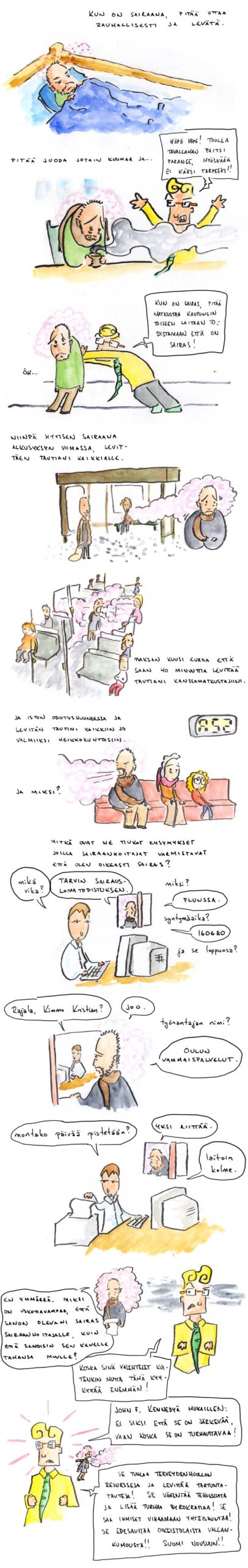 Sarjakuvan ensimmäiset kolme kuvaa on piirretty jo keväällä, kun edellisen kerran olin sairas ja jouduin hakemaan sairauslomatodistuksia maailman ääristä. Väritys, loput kuvat ja teksti kokonaisuudessaan ovat kuitenkin ihan tuoreita. Onnekseni tämä kaikki sairauslomarumba on nyt taakse jäänyttä elämää, sillä irtisanouduin työstäni syyskuun alussa. Saa sairastaa ilman byrokratiaa! Jee!