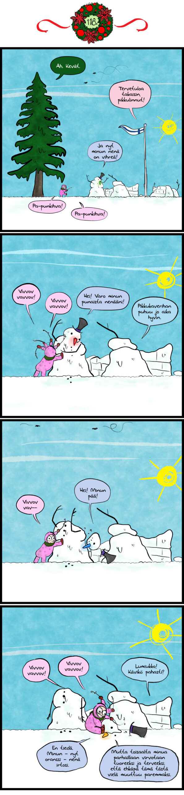 No, nyt piirsin sarjakuvan näin pääsiäisviikon aluksi -- vaikka tämä toki oikeasti onkin joulukalenterin 118. luukku.