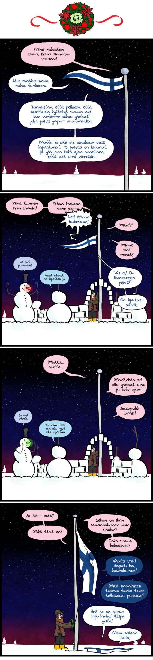 Suomen lippujen kolmiodraama käynnistyy! Kuka saa kenet? Kuinka mustasukkaisia ovat Suomen liput ja isännänviirit? Seuraako väkivaltaisia yhteenottoja? Murhataanko joku -- joko romanttinen kilpailija tai ärsyttäväksi muuttunut nenänsä värejä hokeva lumiukko? Muuttuuko joulukalenteri kevään mittaan Agatha Christie -tyyppiseksi murhamysteeriksi?