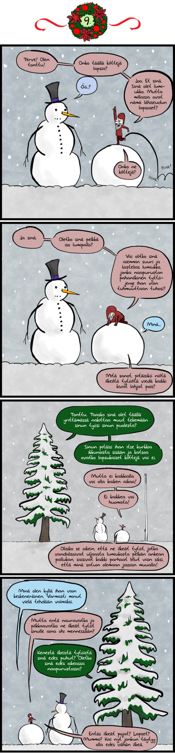 Viisitoista päivää jouluun. Toivottavasti nämä menee aina oikein. Joka kerta, kun kirjoitan tähän jonkun numeron, minut valtaa epävarmuus siitä, että meneeköhän se oikein. Minkähän päivän sarjakuvaa minä taas olinkaan laittamamassa tänne? Montako päivää siitä on jouluun? Ja milloinkas se joulu taas olikaan?