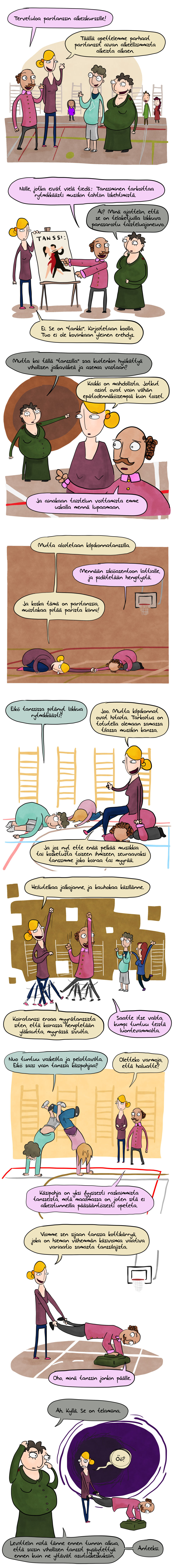 Eihän tämä tietenkään ole mitään muuta kuin vain yhdistelmä tanssin ja uimataidon alkeiskursseja – ja sitten piirtäessä jostain syystä päädyin lisäämään siihen vielä panssarintorjuntaa – mutta eipä sarjakuvan välttämättä paljon enempää pidäkään olla.