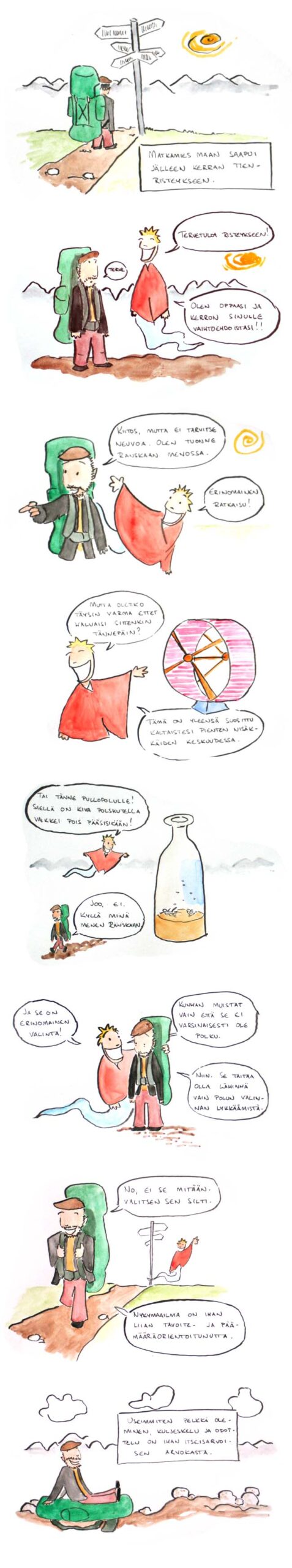 Olen siis poistumassa maasta näinä päivinä. Tämä tarkoittaa sitä, että sivujen päivityksestä tulee mahdollisesti epäsäännöllistä. Niin kauan kun teen sarjakuviani ainoastaan omaksi ilokseni ja ilmaiseksi, voi olla etten jaksa loputtomiin taistella löytääkseni mahdollisuuksia päivittää sarjakuvaa kerran viikossa. Siihen kuitenkin pyrin, ja jos osoittautuu, että sarjakuvien skannaus on helppoa, sivuston toimintaan ei pitäisi tulla mitään muutoksia.