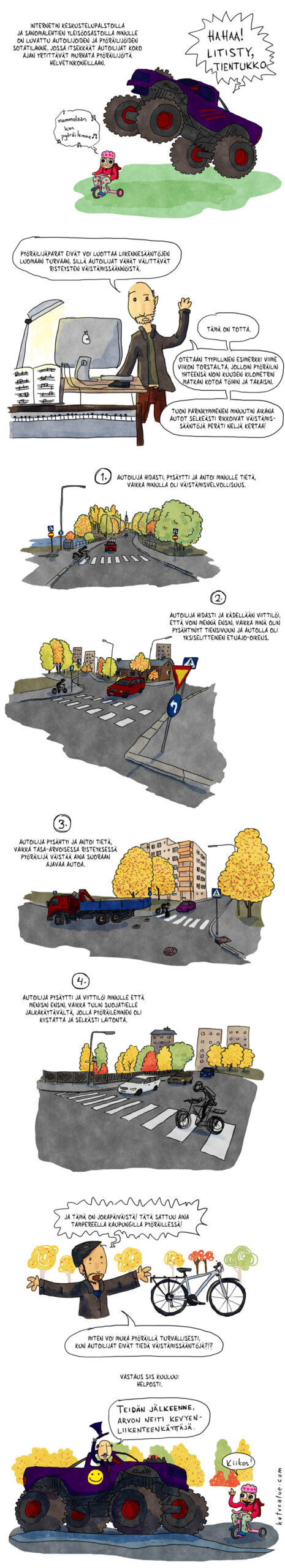 Etenkin kiitos sille autoilijalle, joka pari vuotta sitten jarrutti ja väisti minua kun toiseen pyöräilijään törmättyäni yhtäkkiä kaaduin keskelle autotietä.