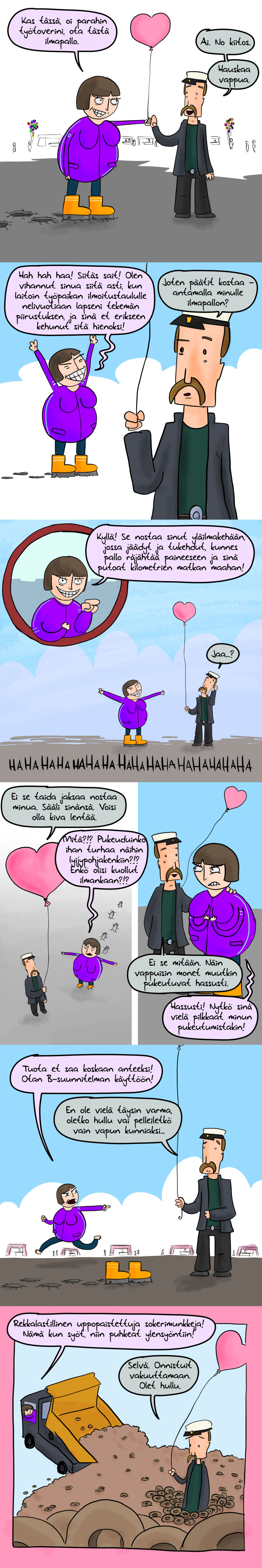 Kirjoittamiseen tarvittava energia on mennyt viime aikoina muihin projekteihin, joten uudelleenpiirsin vanhan sarjakuvani vuodelta 2010. Alkuperäisessä oli ihan hauska teksti, mutta piirrosjälki oli jopa minun piirtämäkseni todella huonoa. Ainoastaan viimeinen kuva oli hyvä, jonka vuoksi se onkin jäljennetty tähän uskollisesti.