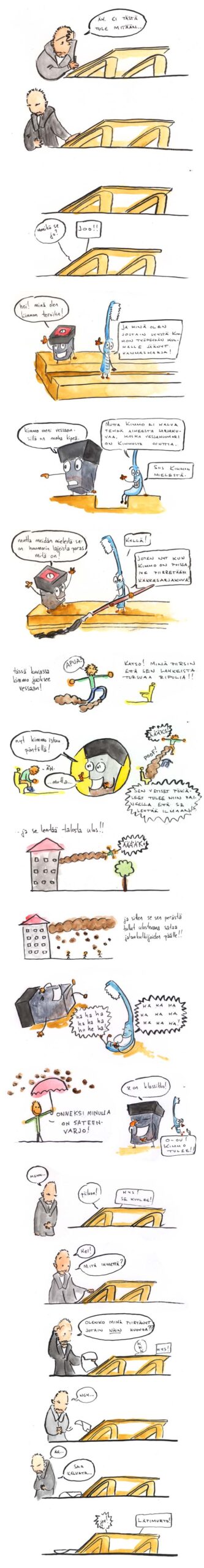Sarjakuva itsessään osin selittää myöhästymisensä, mutta minuun viikonloppuna iskenyt vatsaflunssa on vain pieni osa koko tarinaa. Olen lähdössä kuun vaihteessa noin puoleksi vuodeksi pois Suomesta, jonka vuoksi aikatauluni ovat ihan riittävän täynnä muuttotohinaa ja kaikenlaisten juttujen järjestelyä ilman sarjakuvien piirtämistäkin.
